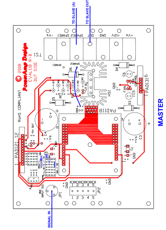 In figures 4a and 4b the schematics 3a and 3b have been given a more physical look as seen on the drawings of the circuit board for the EVAL118. The circuit has an inverting voltage gain of Rf/Rin as established by the components of the same names as seen on the Master drawing of the circuit board. All the components and jumper wires necessary for the parallel connections are drawn in blue. There are other equivalent ways of connecting the nodes, but the drawings show one convenient way to do it. For example, you could use a shielded cable to go directly from the Master at Node P on the circuit board to the input of the Slave.
